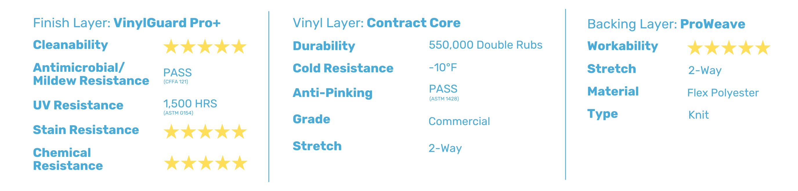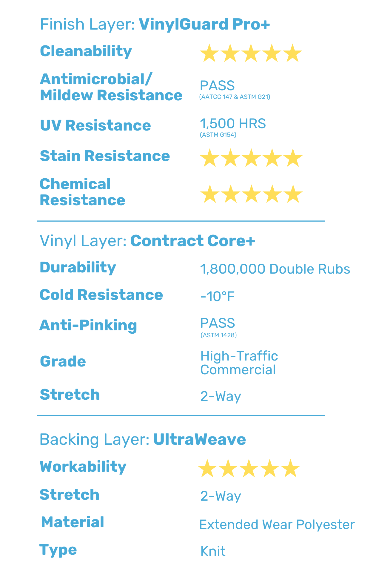 This commercial vinyl features a VinylGuard Pro+ finish for superior stain and chemical resistance, ensuring lasting protection in demanding environments. The Contract Core technology delivers exceptional durability, making it perfect for long-term commercial applications. With a ProWeave flexible backing, it provides superior stability and workability, ensuring a perfect fit and finish. Elevate your commercial seating experience with premier durability, cleanability, and comfort.